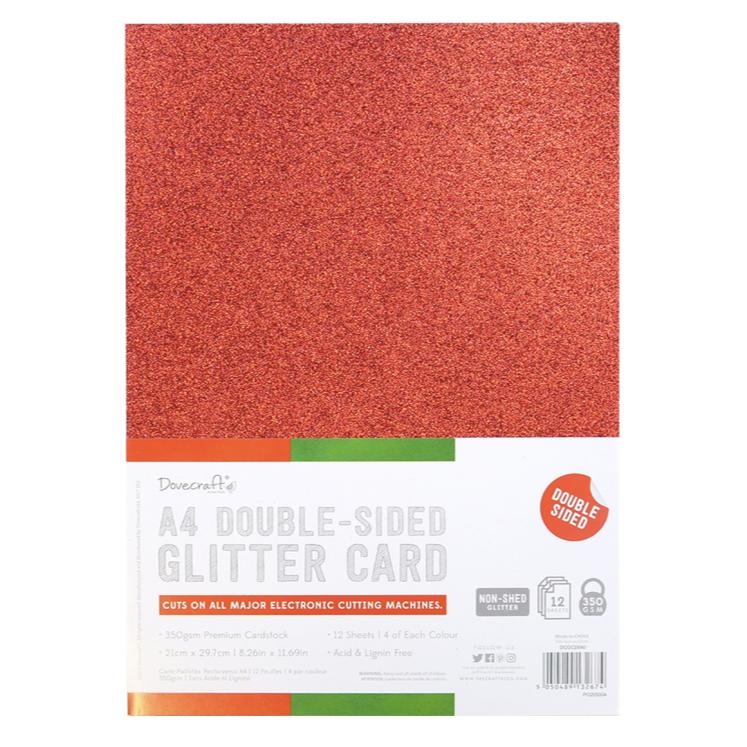Take your glitter die cuts to the next level with the Festive A4 Double Sided Glitter Card from Dovecraft! This 350gsm no shed glitter cardstock is ideal for using with both manual and electronic cutting machines and because it's double sided, it's perfect for 3D projects, including party decorations, gift wrap, and DIY home decor. With three festive shades in every pack, you'll find 100s of ways to use this red, white and green glitter card to embellish your papercrafts!