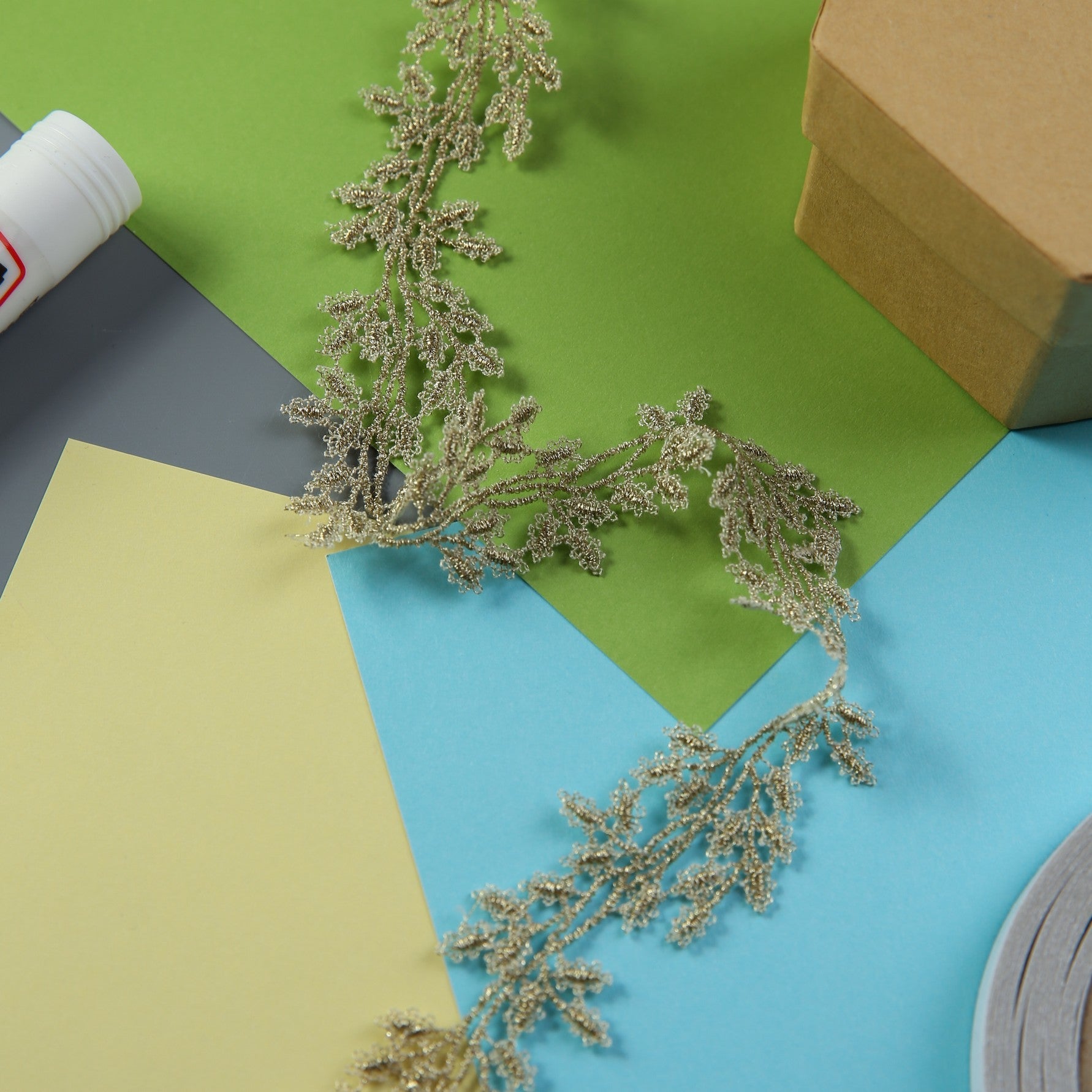 Bold and bright, this gold lace edging will make for the perfect finishing touch to your projects, featuring stunning swirls for a regal look. This lace can be used for embellishing, cards, textiles, home décor and much more. Can be easily attached by gluing or sewing. The edging measures approximately 3.4cm wide at the widest point.