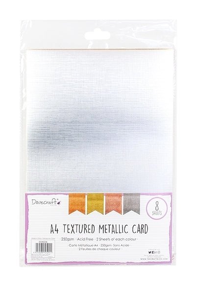 Add plenty of metallic shine to your papercraft projects with this 8-sheet pack of Dovecraft A4 textured metallic card.