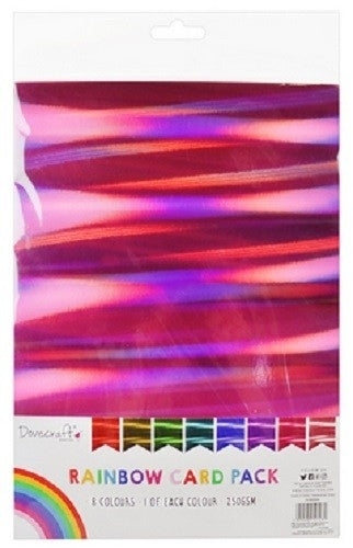 Add heaps of shine to your papercraft projects with the Dovecraft holographic 8 sheet rainbow card pack.