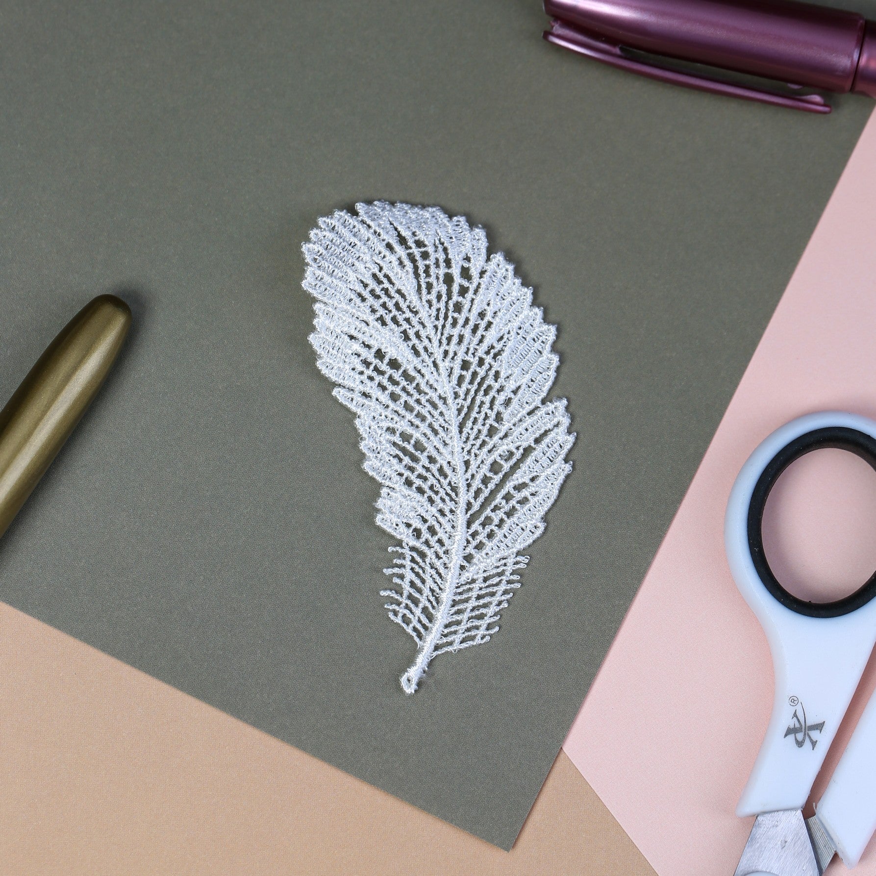 Decorate your designs with these lace feather appliques, embroidered in an ivory thread for a dainty look. Use for embellishing papercrafts, textiles or home décor and much more. Can be attached to projects by sewing or gluing. Pack contains 1 feather applique. Each feather measures approximately 8cm by 4cm at widest points.