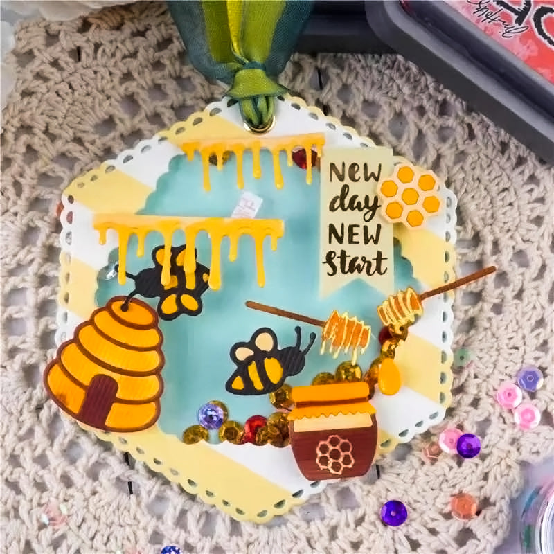 This die set is a must have for crafters with a love of bees and nature! Featuring honey drip edges, honeycomb, bees, a beehive (of course), and a few more! Perfect for using alone or together to make unique cards and scrapbook pages. The longest edge measures approximately 120mm and the smallest honeycomb approx. 19mm. Fits most personal die-cutting machines.