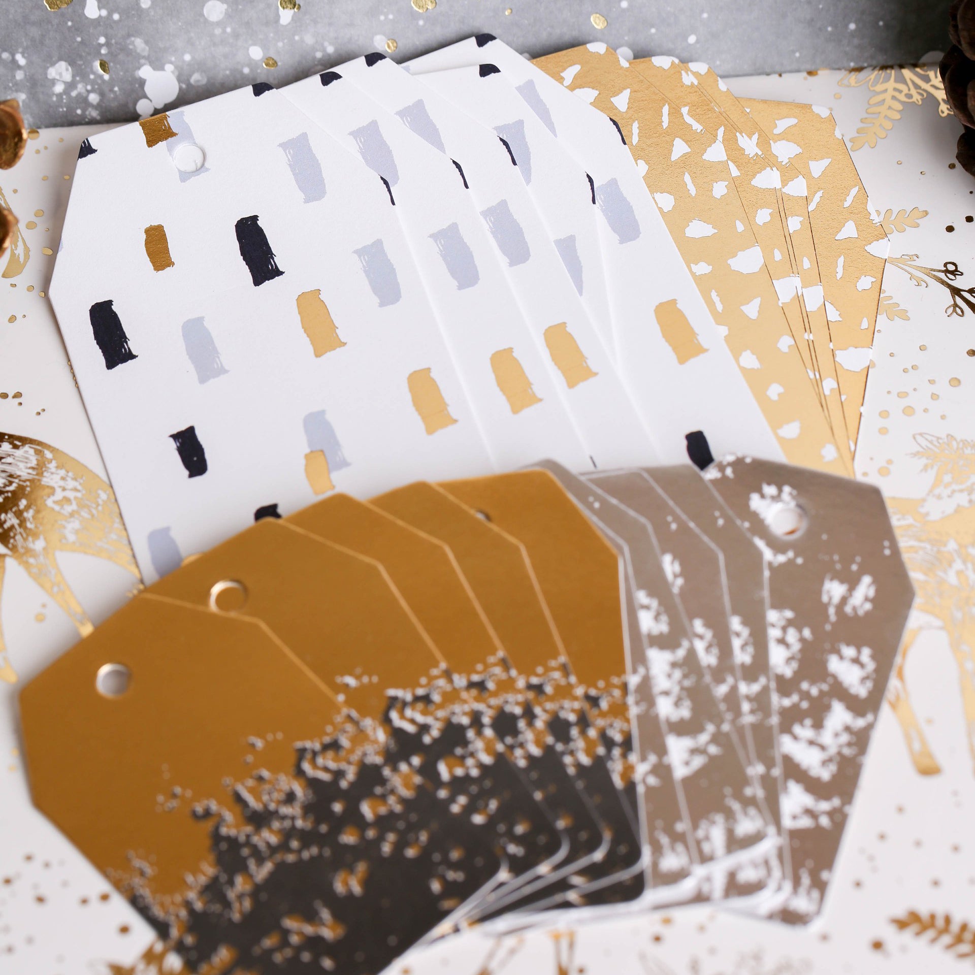 This collection features stunning gold and silver foiled textures and surfaces in striking contemporary patterns. Perfect for adding an on trend, luxurious vibe to any craft project. This pack contains 20 printed tags with brown string, in 4 individual designs and 2 sizes. Small tag is approx. 48 x 80mm. Large tag is approx. 117 x 63mm. 350gsm.