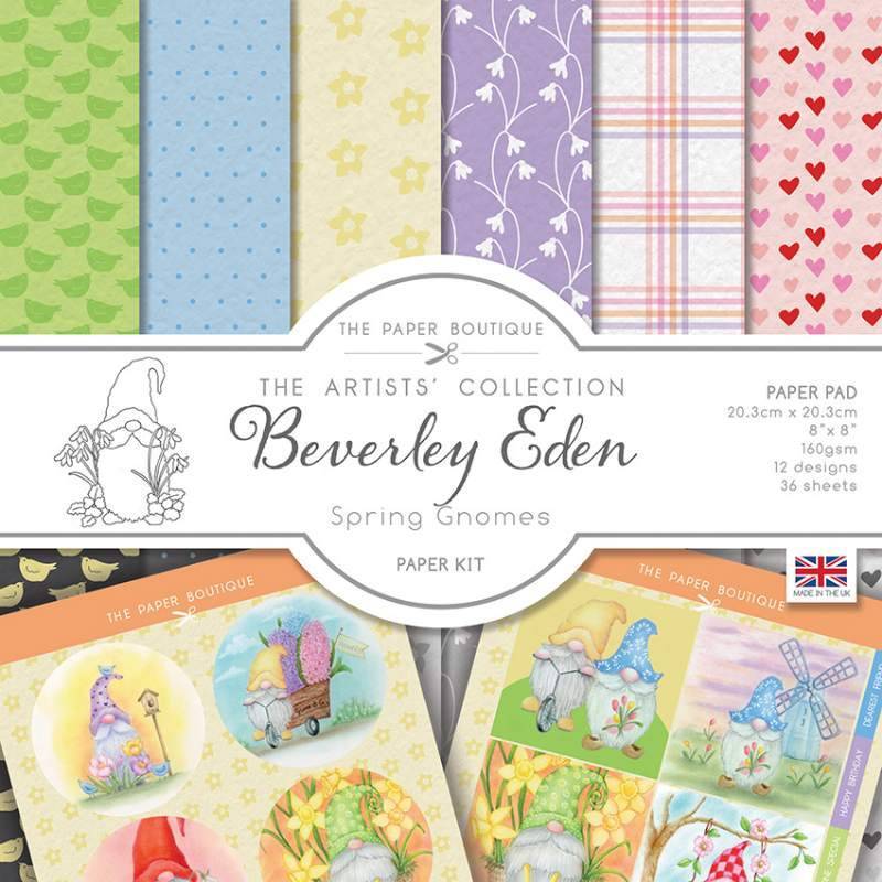 The Paper Boutique Spring Gnomes Paper Collection contains artwork by Beverley Eden, sure to make you smile as you craft. The collection contains designs suitable for all ages; a fun assortment that will mix and match to make cards, scrapbook pages, and mixed media projects!